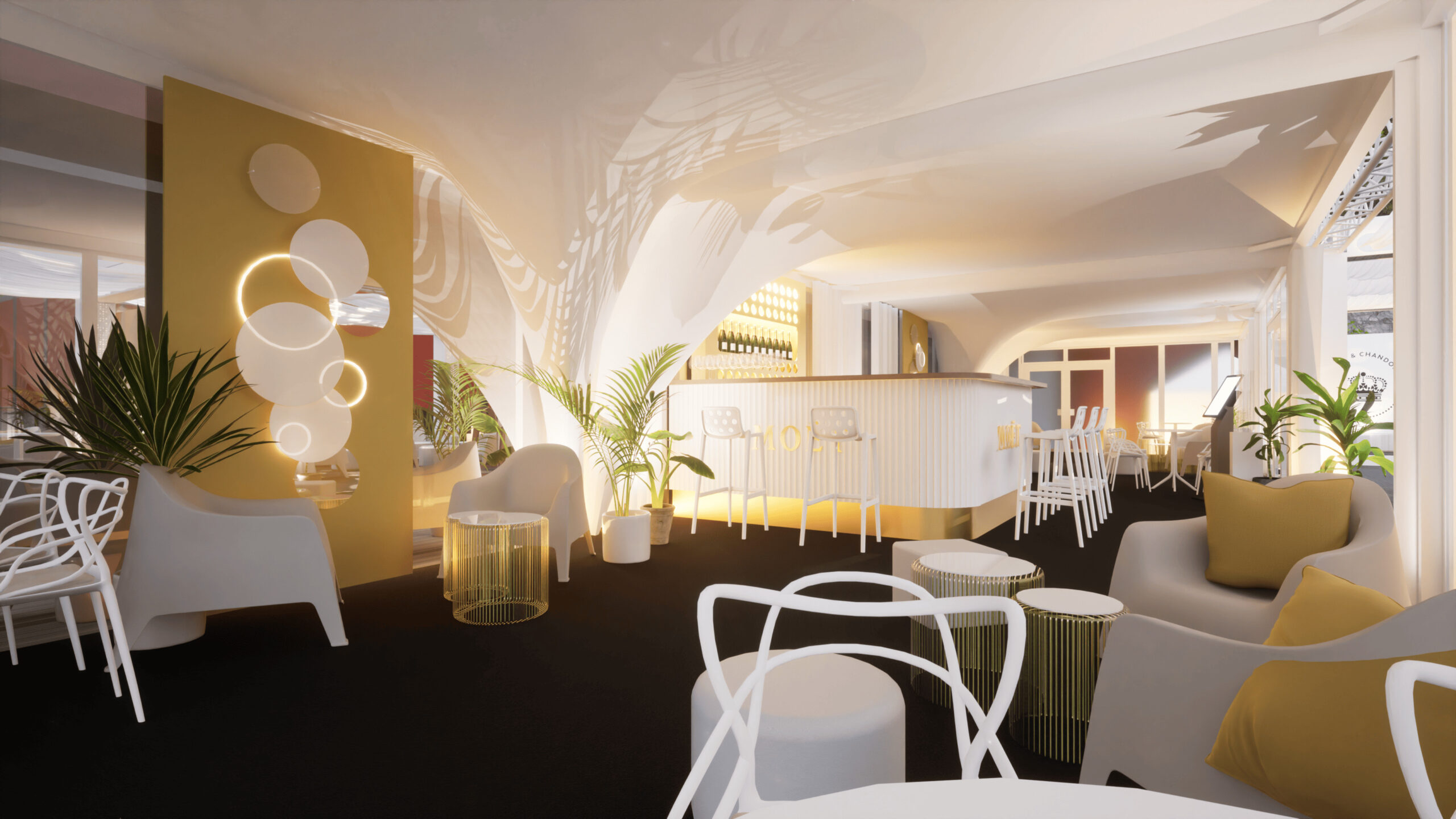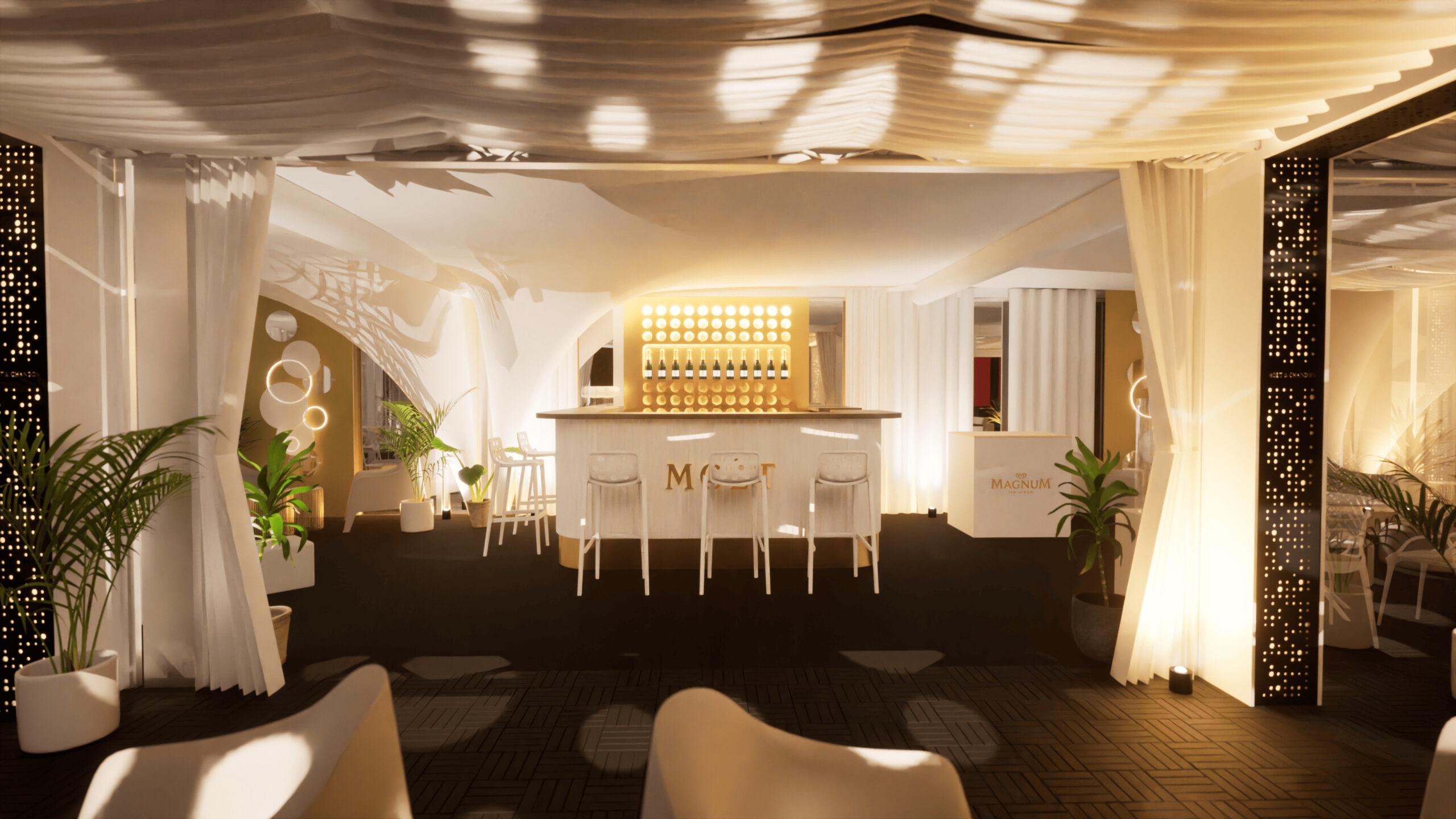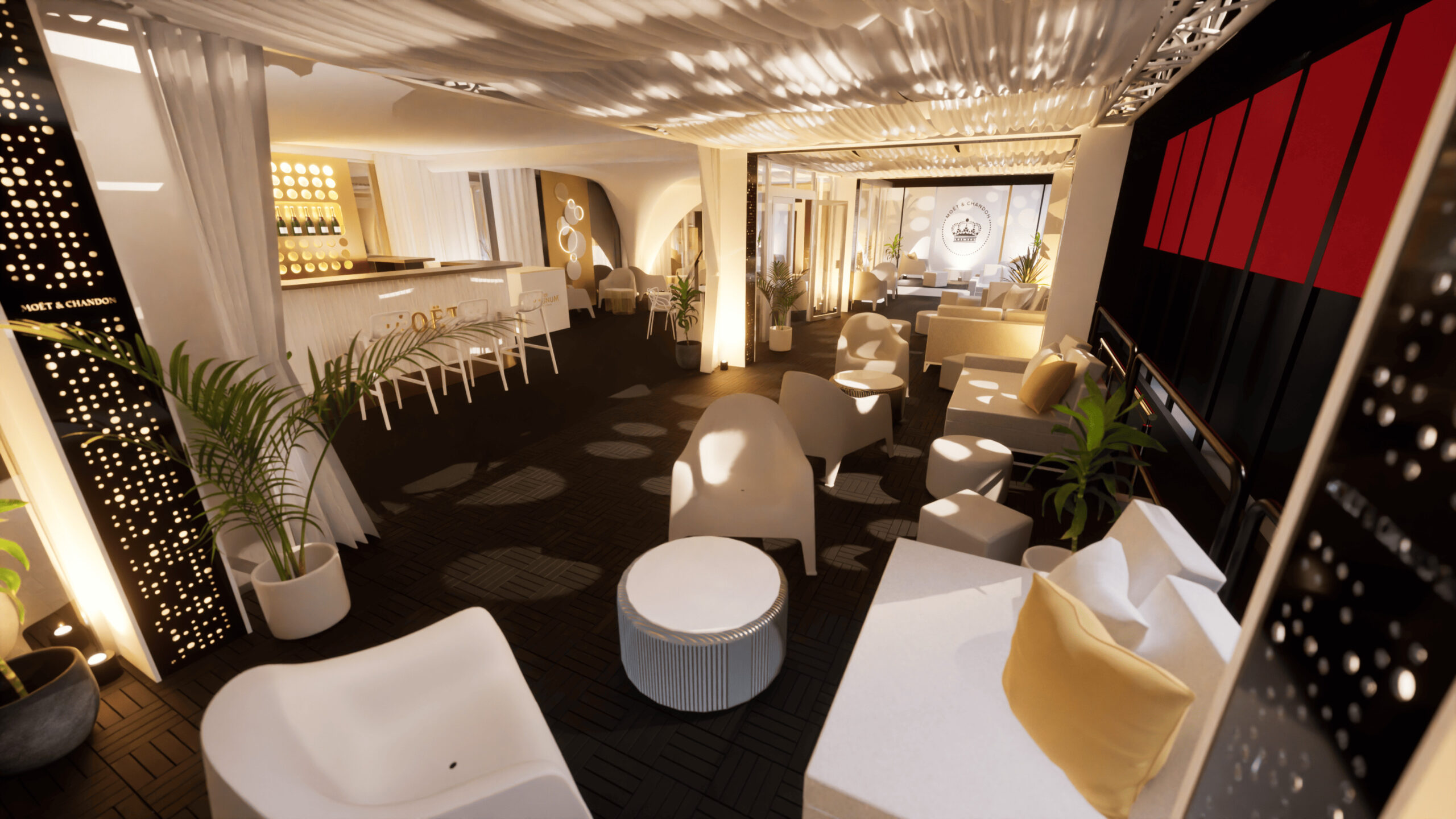Welcome to MOËT LOUNGE at KVIFF 2023 🥂 We have been preparing the Moët & Chandone zone at KVIFF for the third year now, and just like last year, it has been a challenge. This is especially due to the venue, which required us to lift the entire zone and bridge the concrete flowerpots across the entire terrace of the Thermal hotel. However, this step ultimately led to significant features of this year’s zone, such as the conical staircase connected to the photo wall or the truss structure that stretched from the entrance almost to the end of the zone, carrying fabric canopies, sound, and other equipment. A new addition compared to the previous edition was also the central bar, which became the pulsating focal point of the zone.