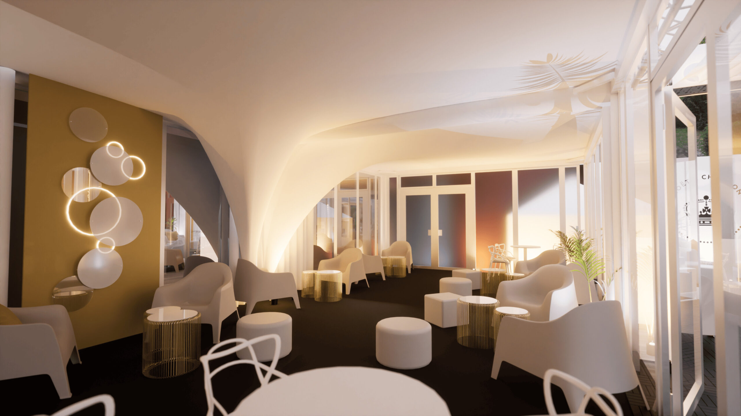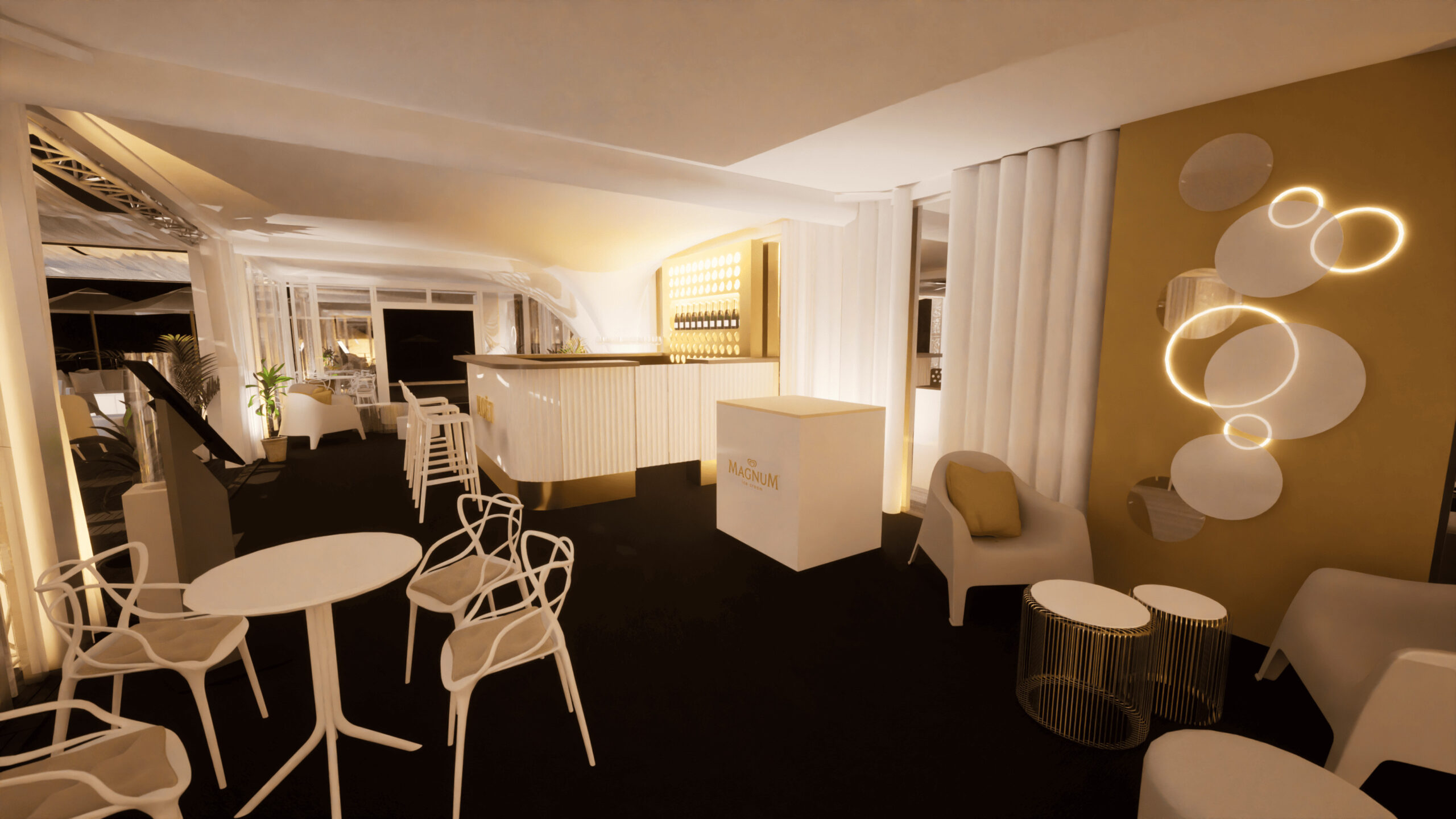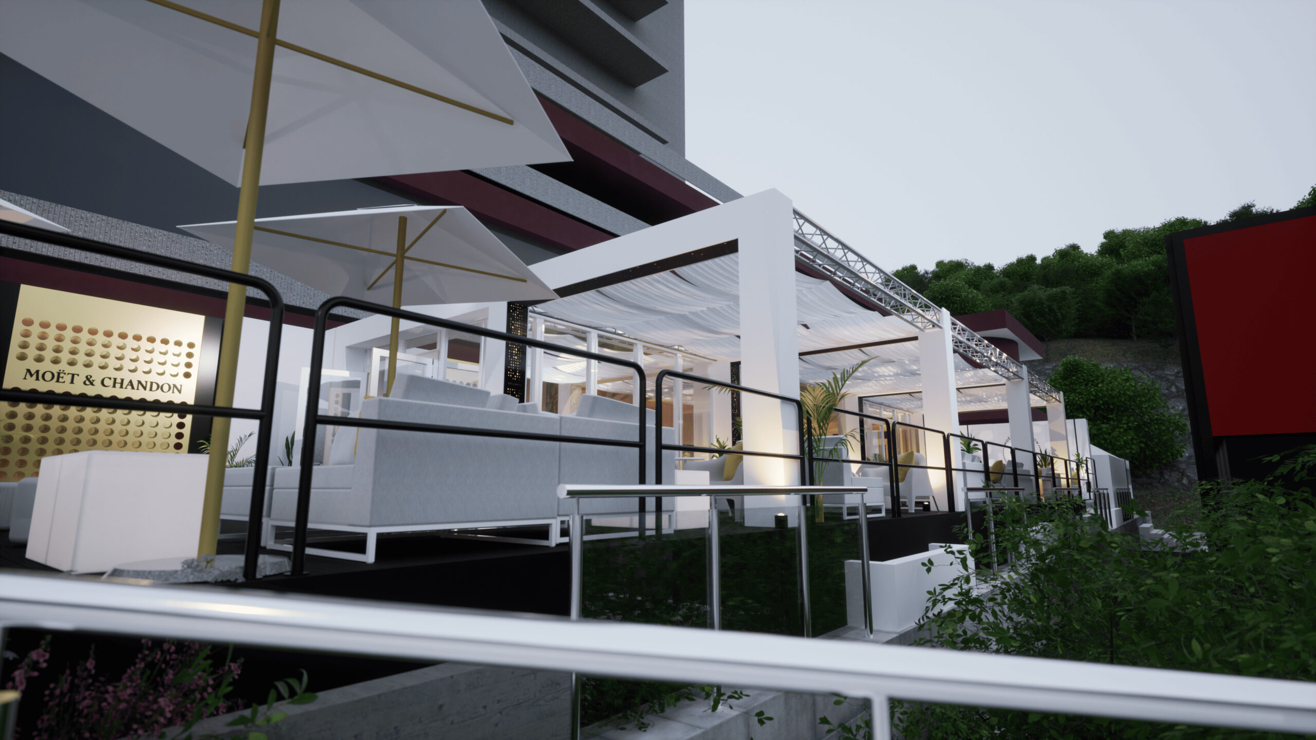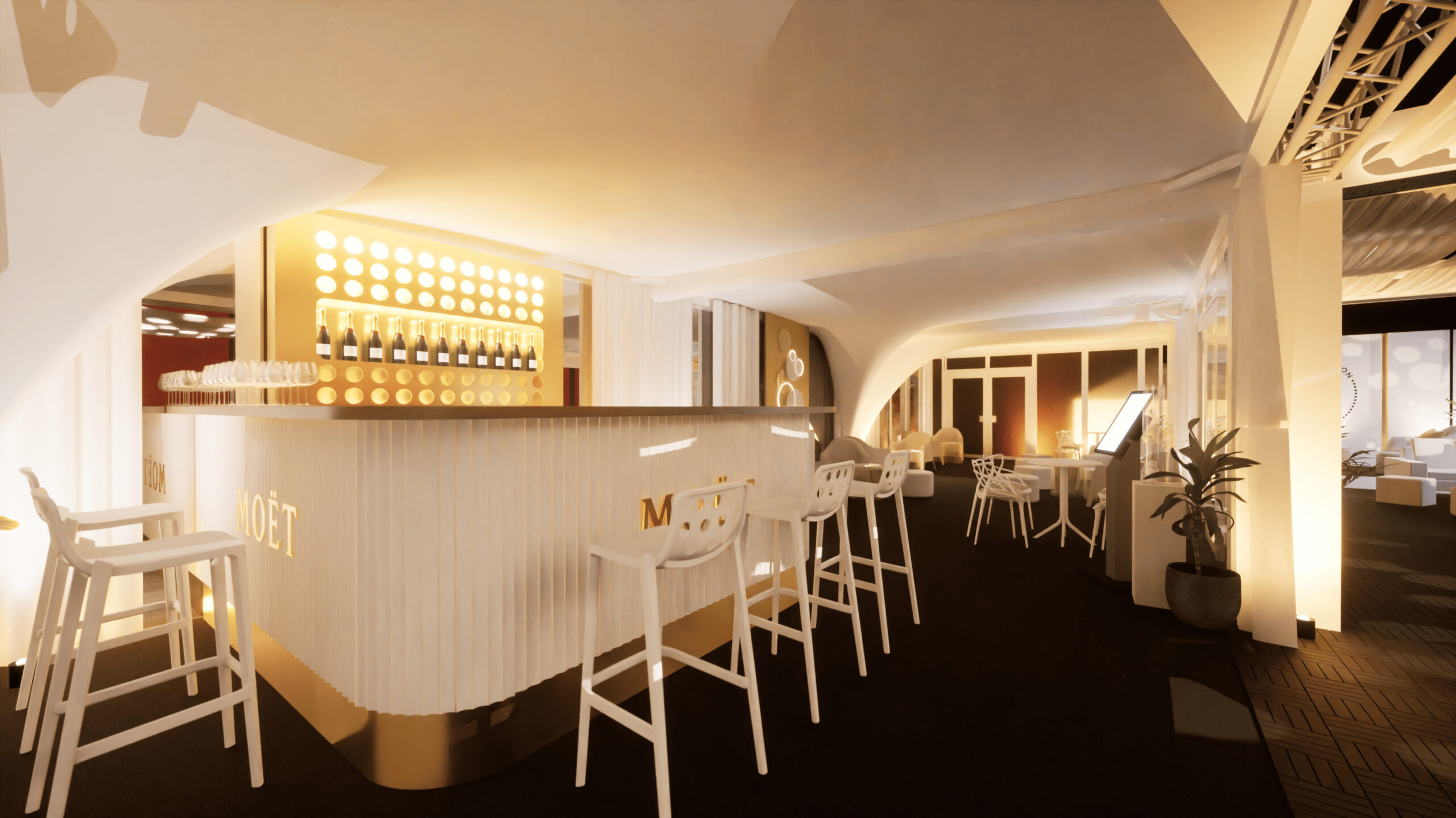 Welcome to MOËT LOUNGE at KVIFF 2023 🥂 We have been preparing the Moët & Chandone zone at KVIFF for the third year now, and just like last year, it has been a challenge. This is especially due to the venue, which required us to lift the entire zone and bridge the concrete flowerpots across the entire terrace of the Thermal hotel. However, this step ultimately led to significant features of this year’s zone, such as the conical staircase connected to the photo wall or the truss structure that stretched from the entrance almost to the end of the zone, carrying fabric canopies, sound, and other equipment. A new addition compared to the previous edition was also the central bar, which became the pulsating focal point of the zone.
