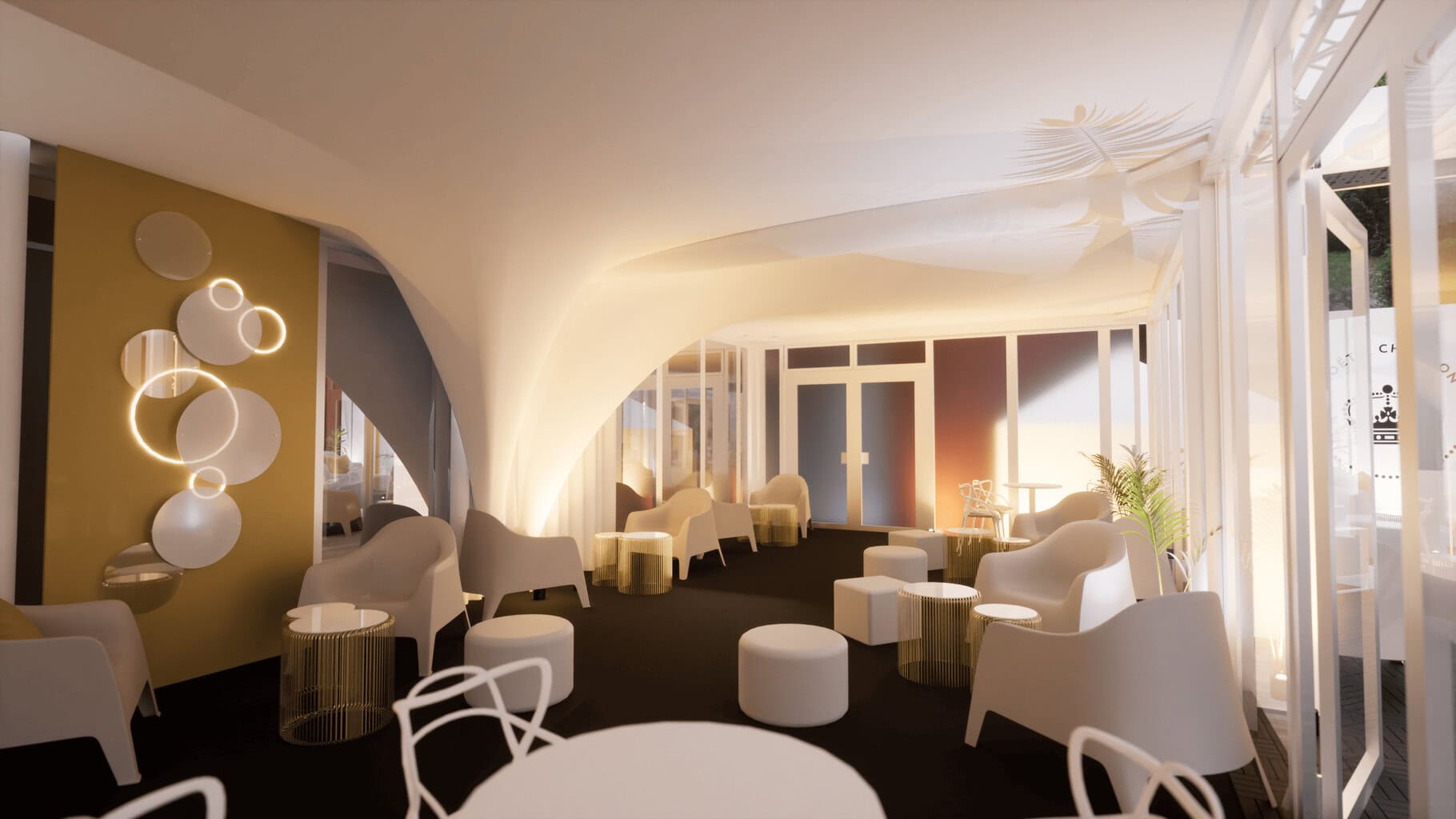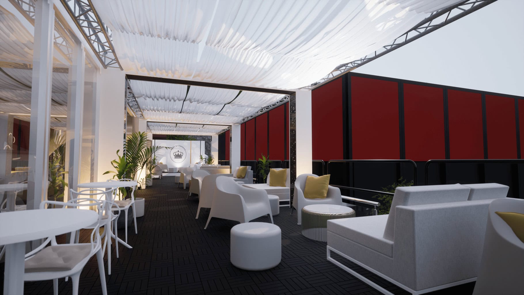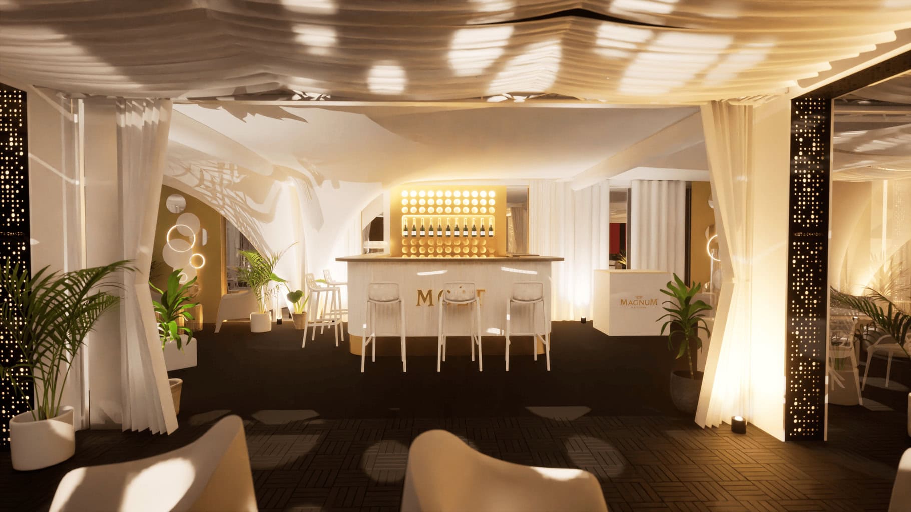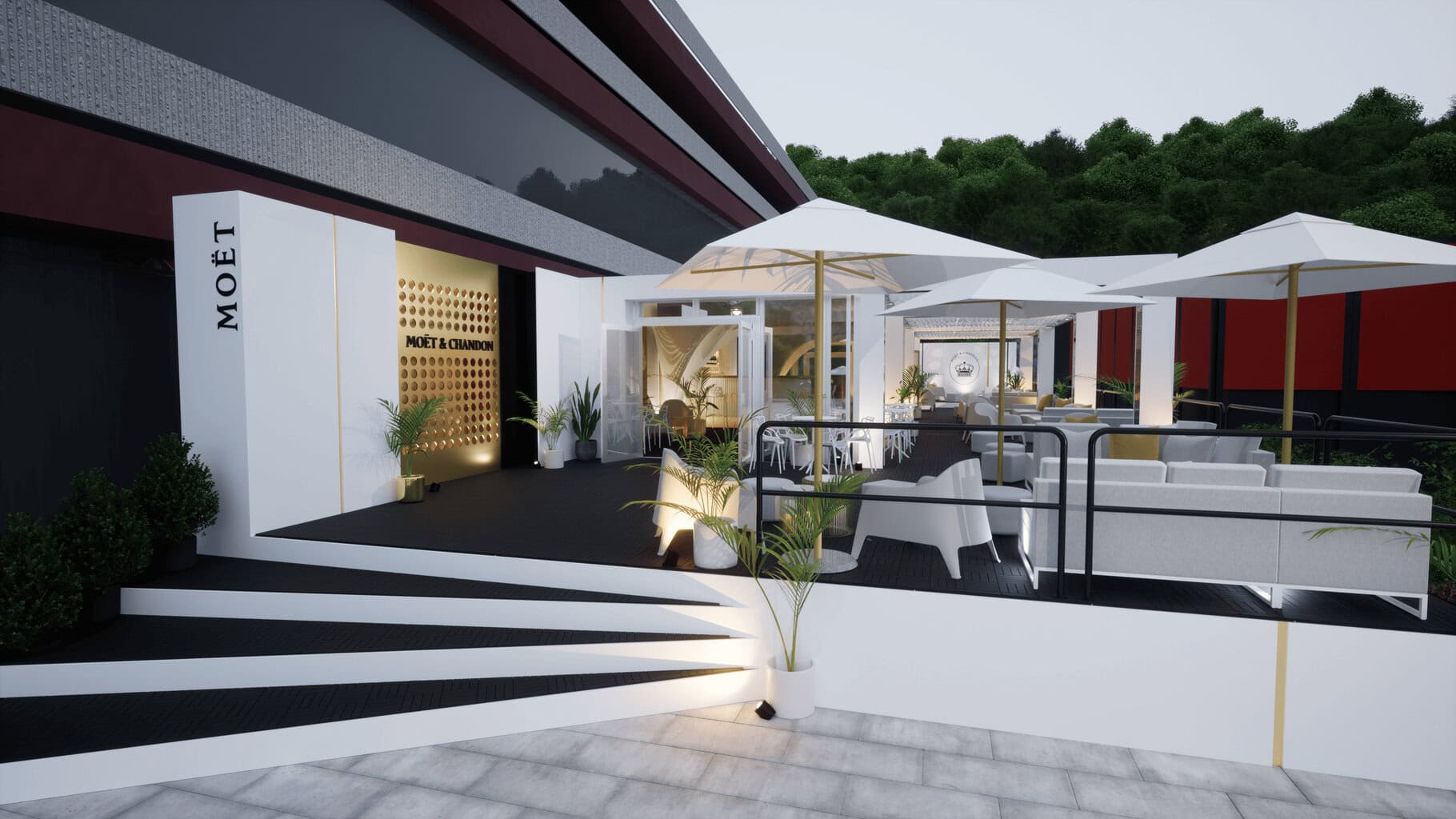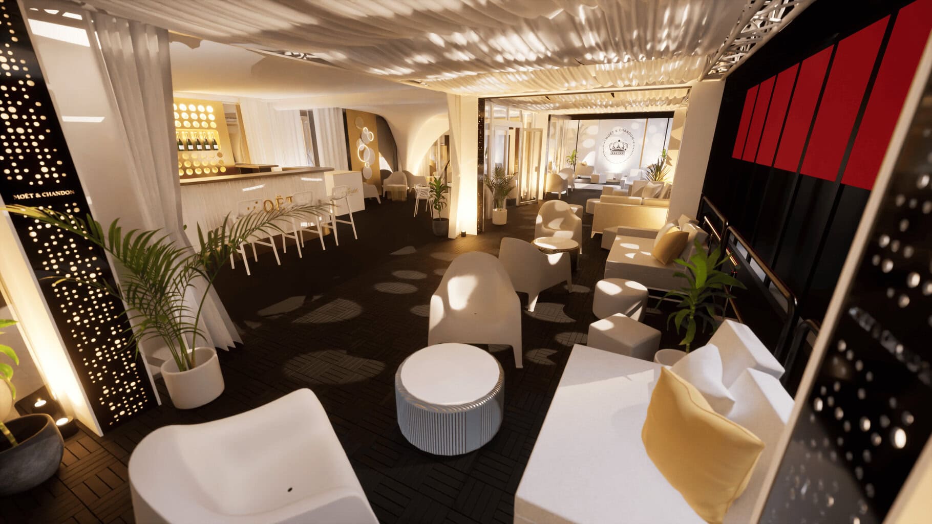 Zónu pro Moët & Chandon na KVIFF jsme připravovali již třetím rokem a stejně jako v předchozích letech byl výzvou. A to i vzhledem k místu konání, které nás nutilo celou zónu zvednout a překlenout tak betonové květináče napříč celou terasou hotelu Thermal. Tento krok ale nakonec vedl k výrazným znakům letošní podoby zóny, jako je například kónické schodiště navazující na fotostěnu nebo trussová konstrukce, sahající od vstupu až takřka po konec zóny nesoucí látkové baldachýny, zvuk a další techniku. Novinkou oproti předchozímu ročníku byl i centrální bar, který se stal pulzující dominantou zóny.